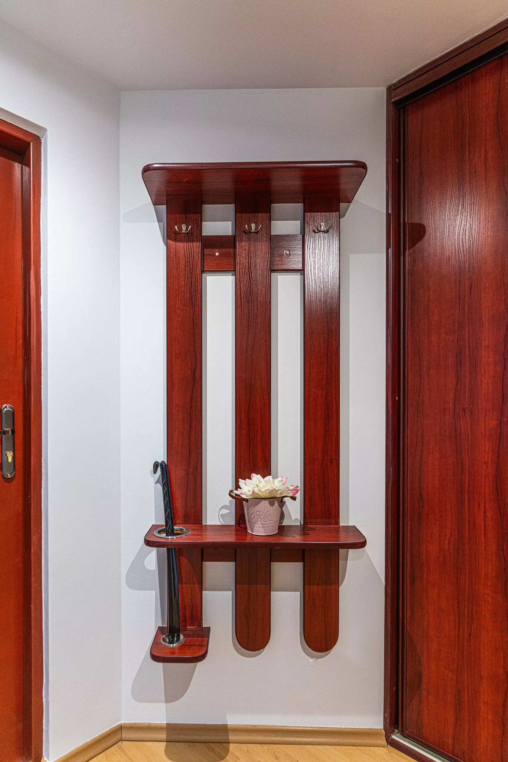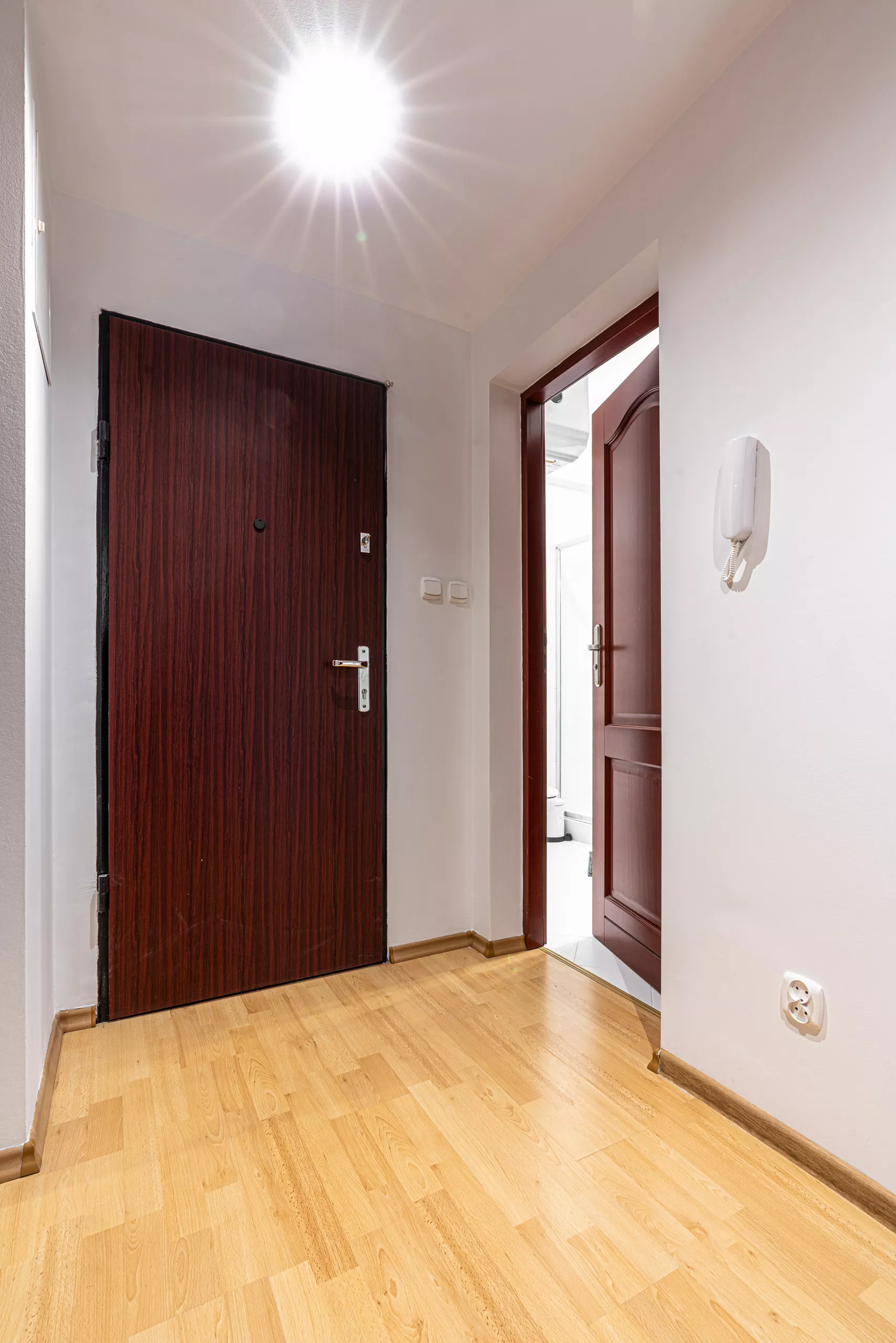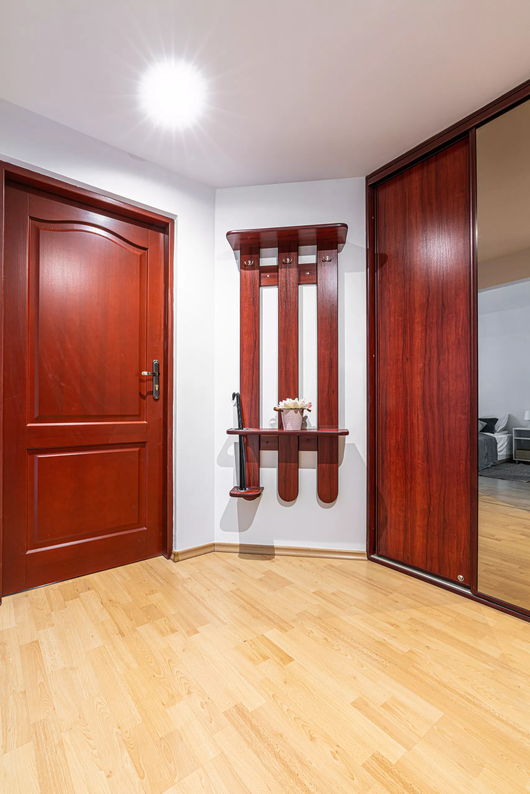 Przedpokój jest przestronny i funkcjonalnie zaprojektowany. Znajduje się w nim praktyczny wieszak na okrycia wierzchnie, co ułatwia organizację. Duże lustro, umieszczone na jednej ze ścian, nie tylko optycznie powiększa przestrzeń, ale również umożliwia szybkie sprawdzenie wyglądu przed wyjściem. Z tego miejsca dostępne są dwa pomieszczenia: łazienka oraz sypialnia, do których prowadzą oddzielne wejścia. Jasna przestrzeń i wygodny układ sprawiają, że stanowi on idealne wprowadzenie do reszty mieszkania.