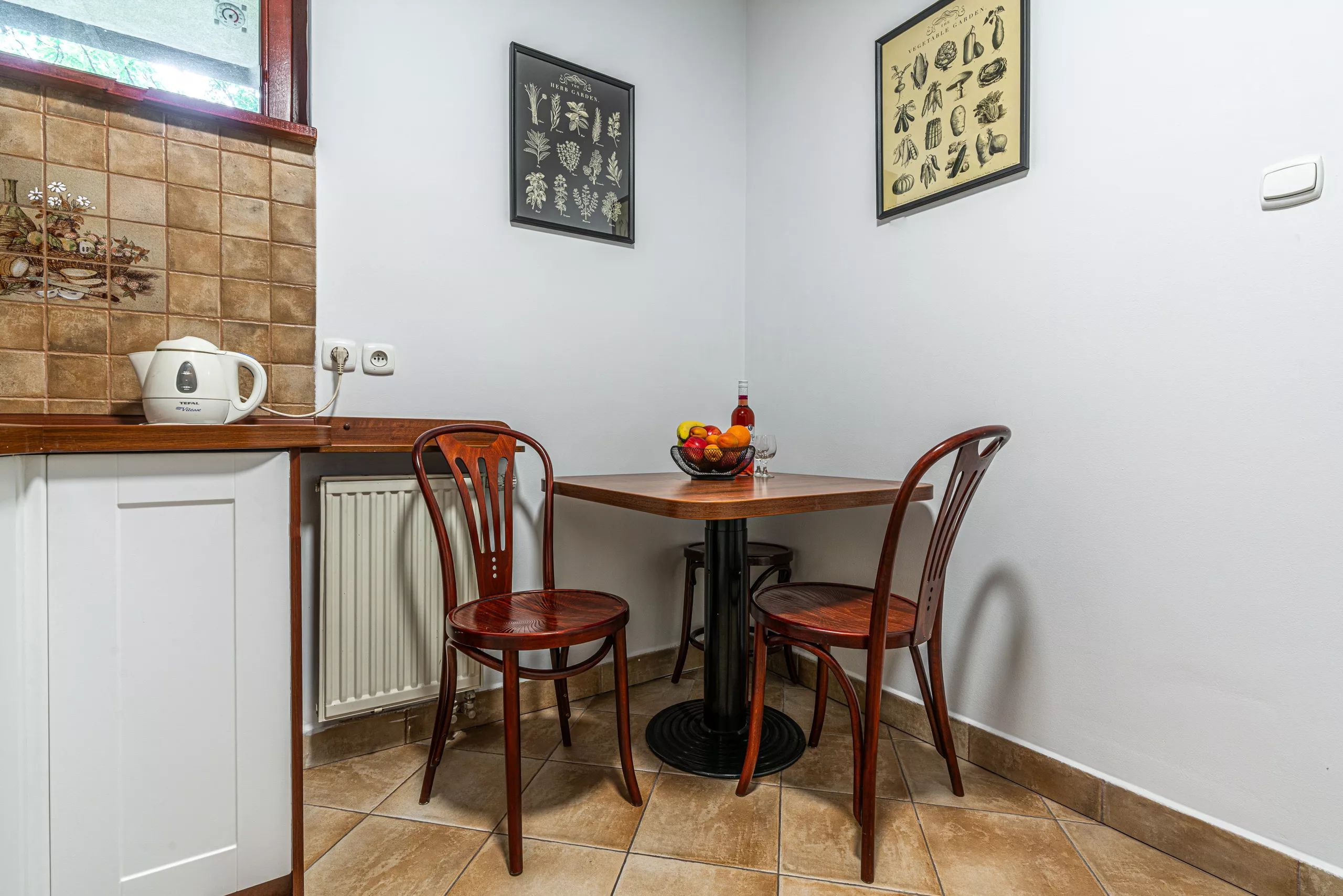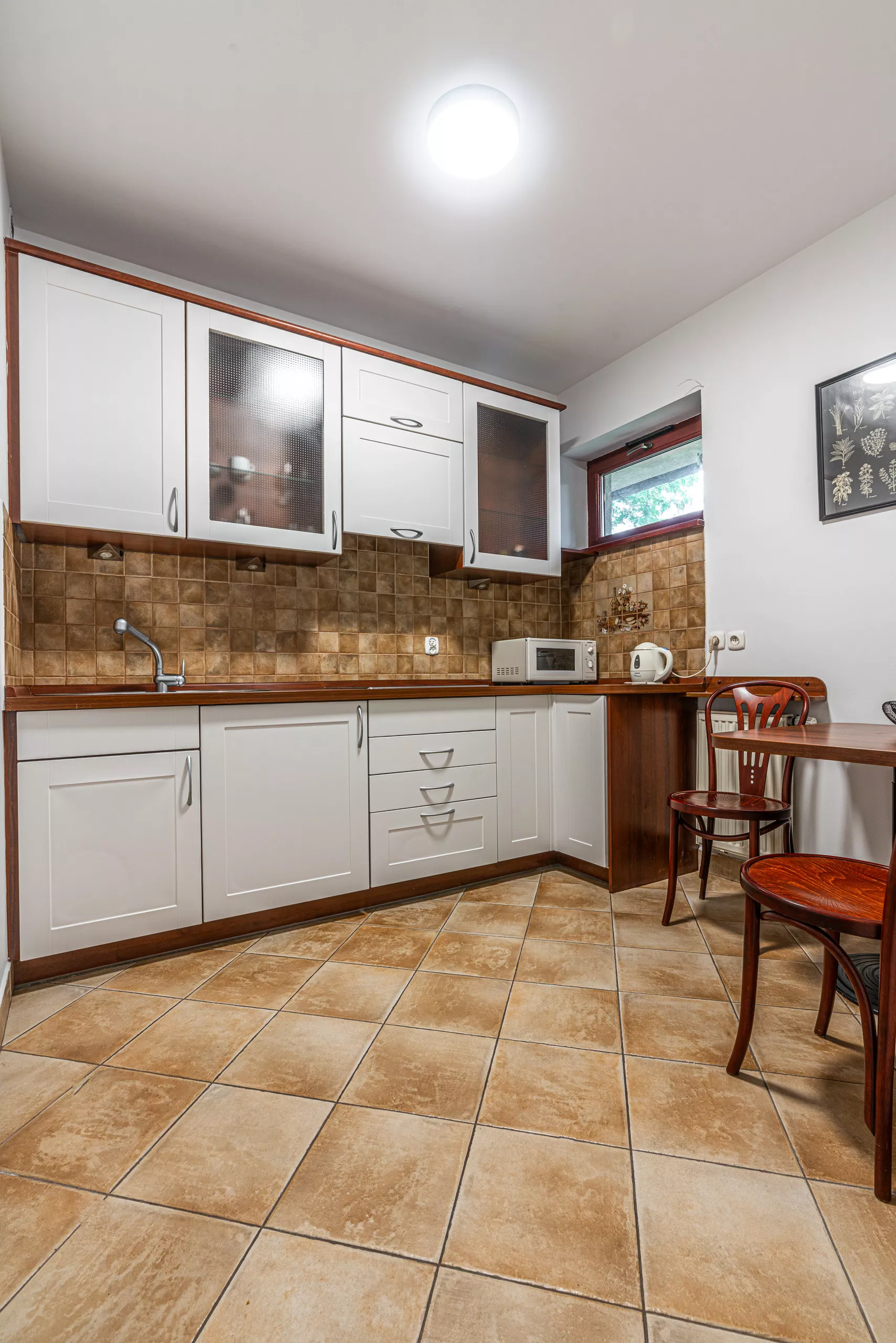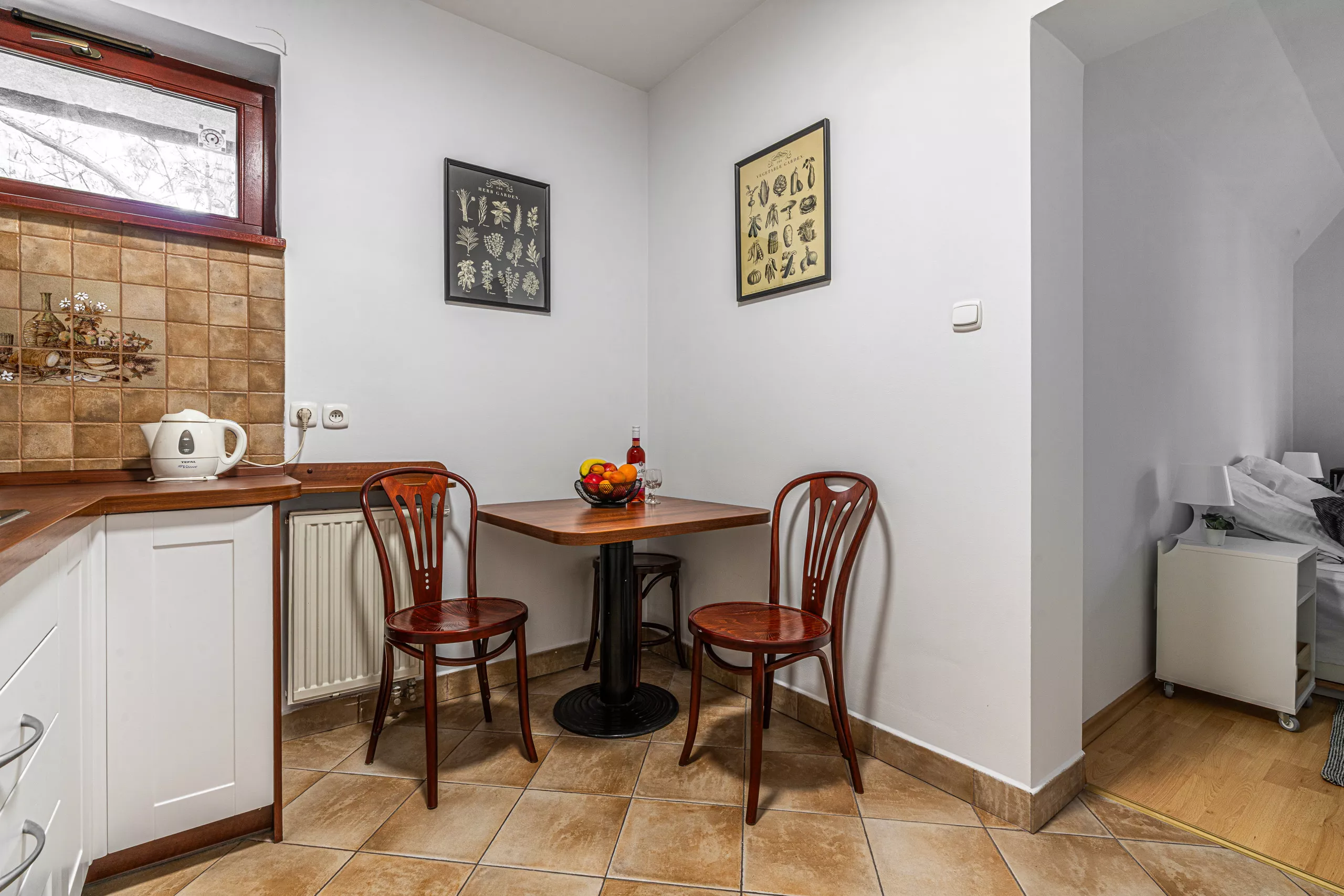 Przytulna kuchnia połączona z sypialnią – otwarta przestrzeń bez drzwi. Kuchnia wyposażona w małą lodówkę, kuchenkę mikrofalową, czajnik elektryczny oraz płytę elektryczną do gotowania. Do dyspozycji jest również komplet naczyń, sztućców i szklanek, co umożliwia wygodne przygotowywanie i spożywanie posiłków. Dodatkowo znajduje się tu stolik z dwoma krzesłami, idealny na szybkie śniadanie lub kameralny posiłek. Praktyczna i funkcjonalna przestrzeń, zaprojektowana z myślą o wygodzie.