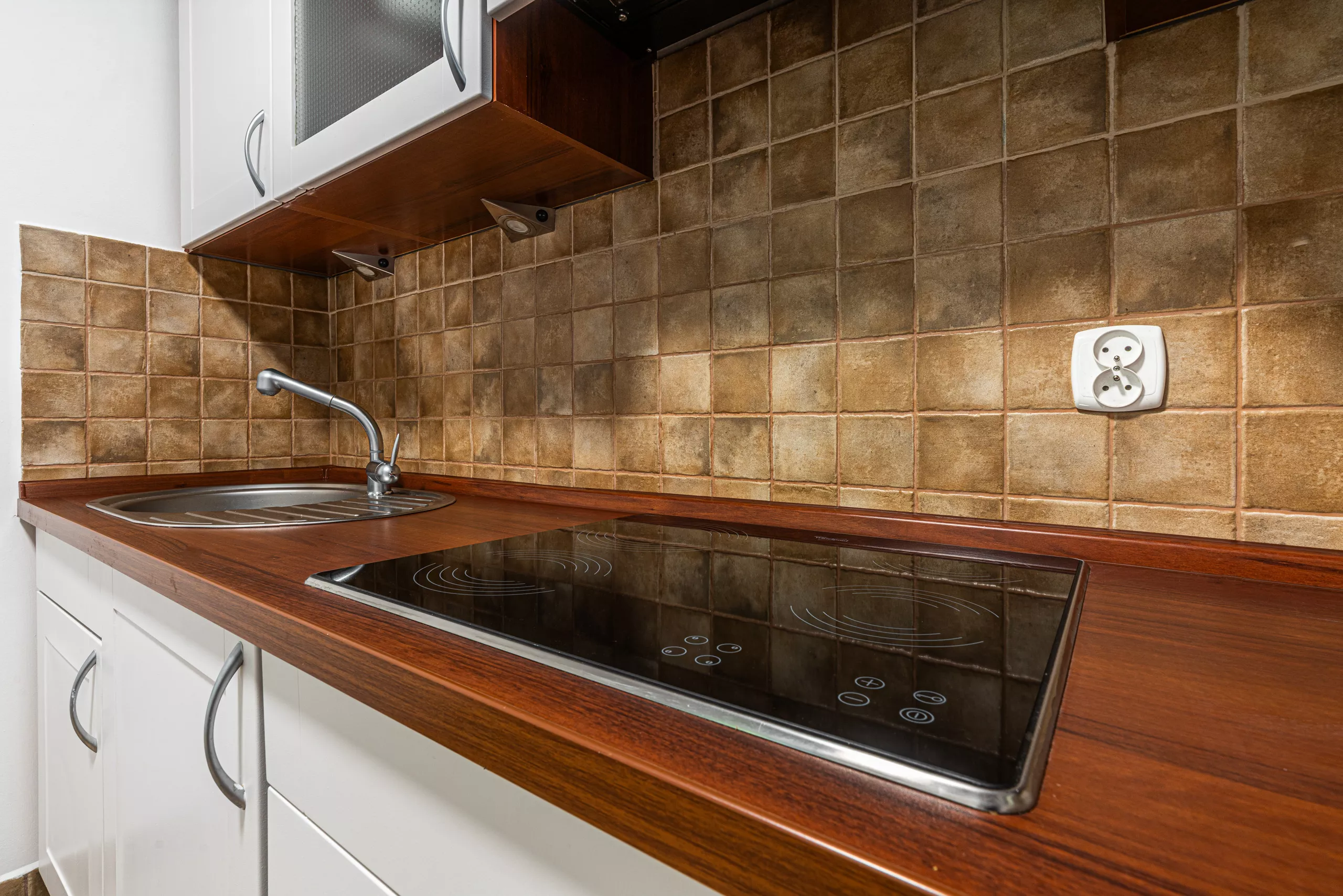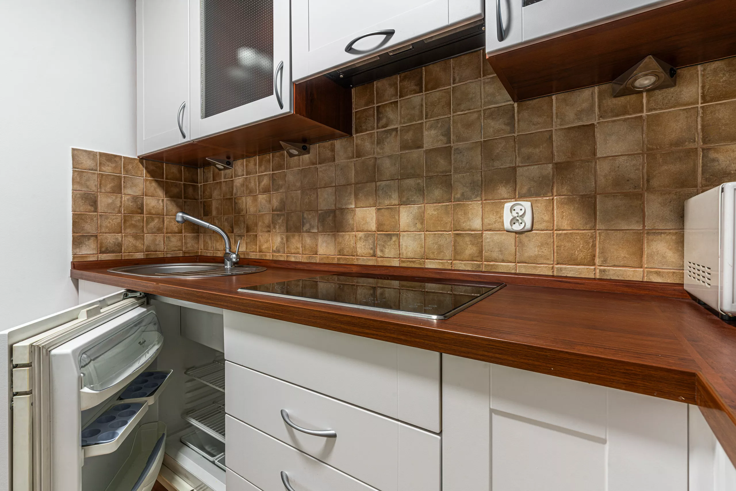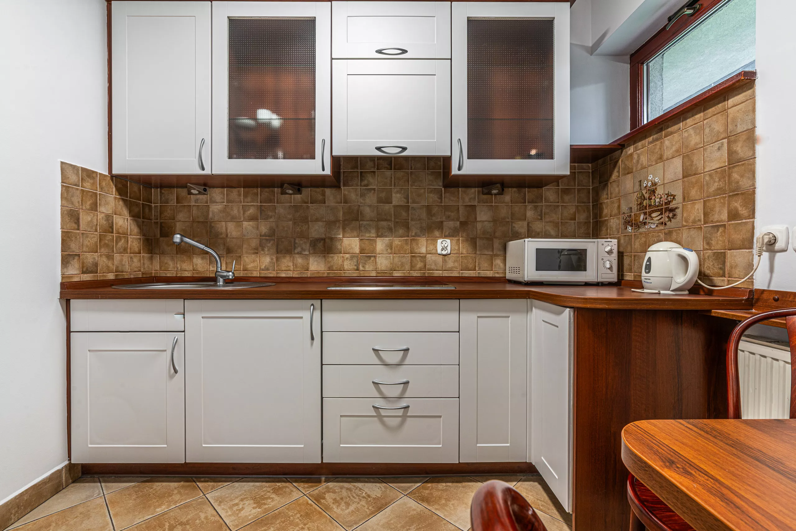 Przytulna kuchnia połączona z sypialnią – otwarta przestrzeń bez drzwi. Kuchnia wyposażona w małą lodówkę, kuchenkę mikrofalową, czajnik elektryczny oraz płytę elektryczną do gotowania. Do dyspozycji jest również komplet naczyń, sztućców i szklanek, co umożliwia wygodne przygotowywanie i spożywanie posiłków. Dodatkowo znajduje się tu stolik z dwoma krzesłami, idealny na szybkie śniadanie lub kameralny posiłek. Praktyczna i funkcjonalna przestrzeń, zaprojektowana z myślą o wygodzie.