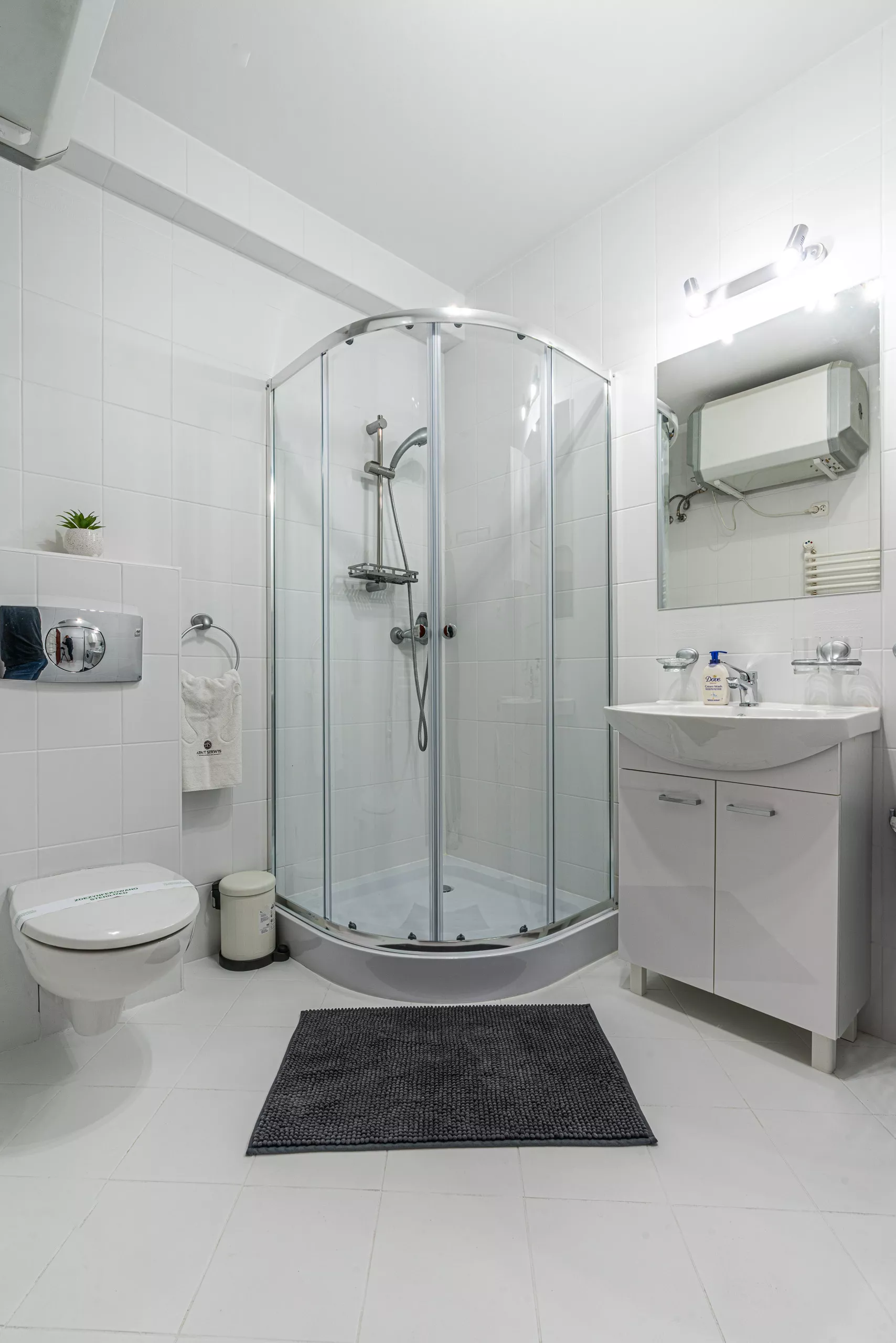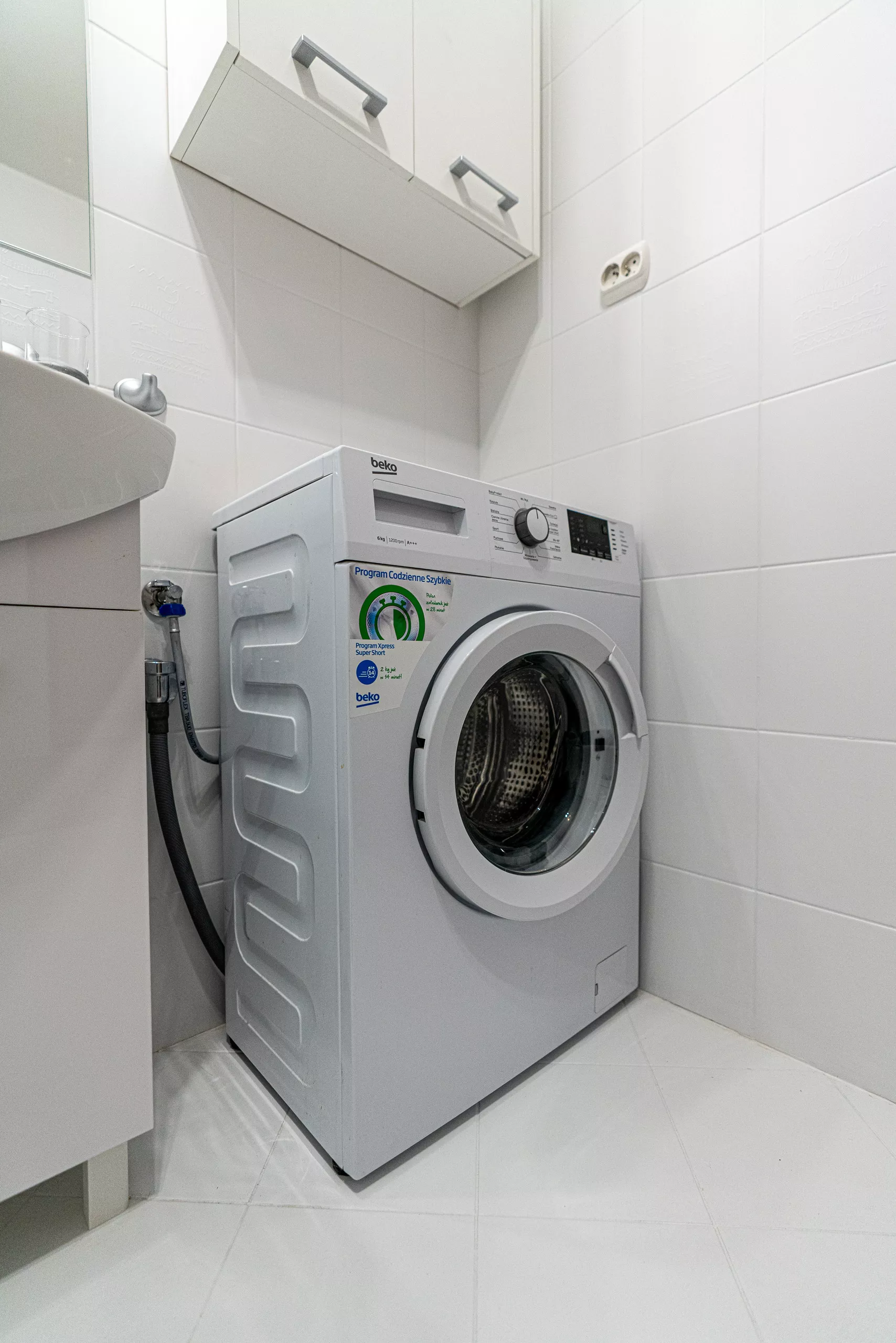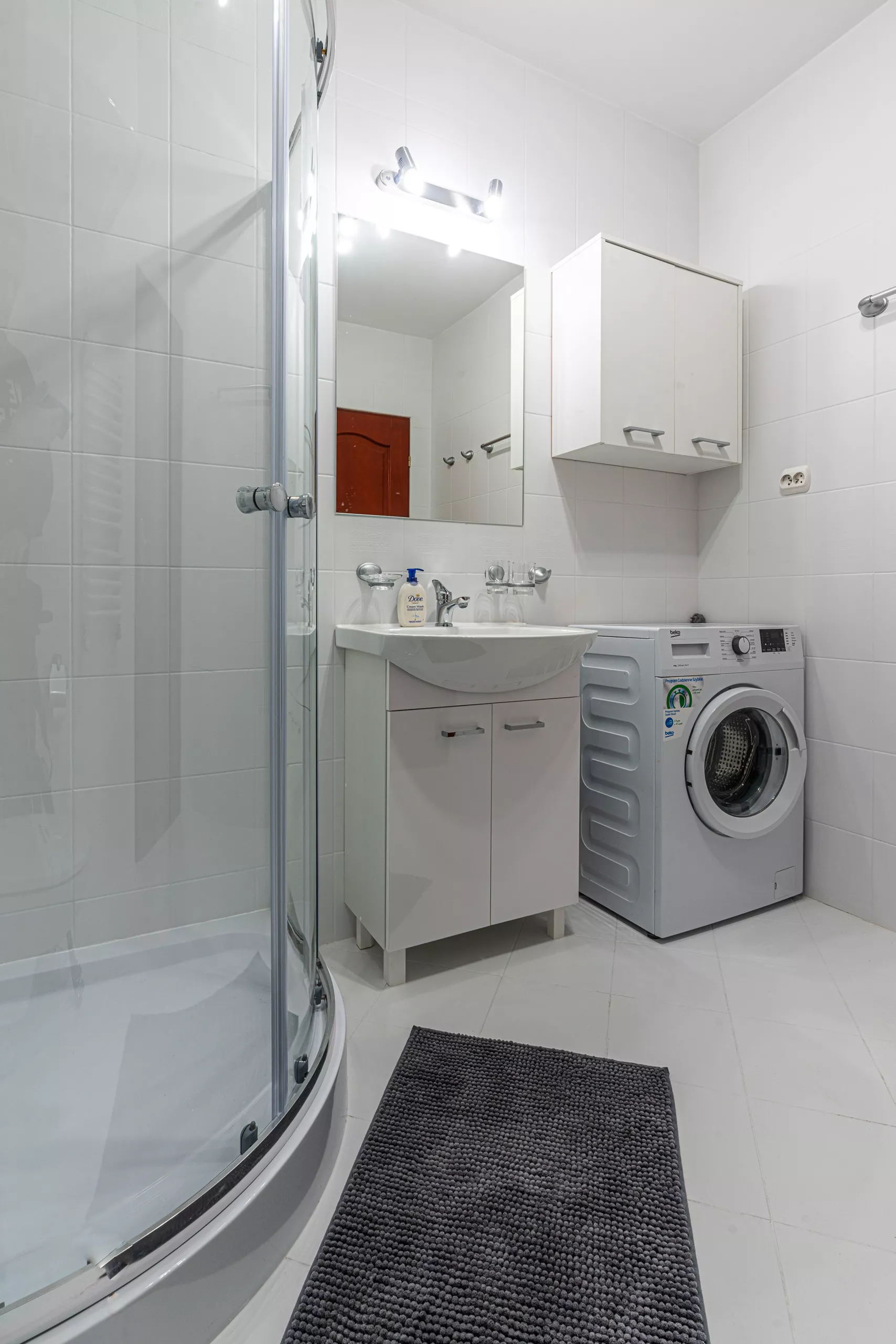 Łazienka przestronna, utrzymana w całości w białej kolorystyce, co nadaje jej nowoczesny i czysty wygląd. Wyposażona w kabinę prysznicową, toaletę (WC), bojler zapewniający ciepłą wodę oraz pralkę, co czyni ją w pełni funkcjonalną i wygodną do codziennego użytku. Idealna dla osób ceniących jasne, minimalistyczne wnętrza z praktycznym wyposażeniem.