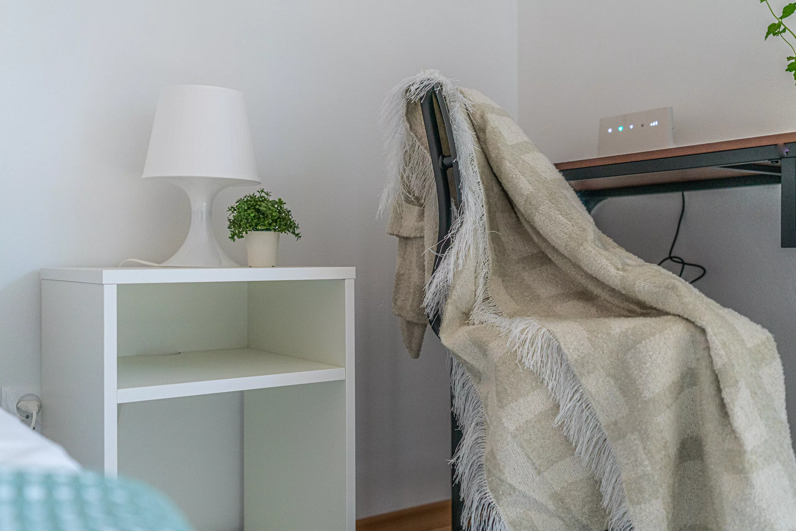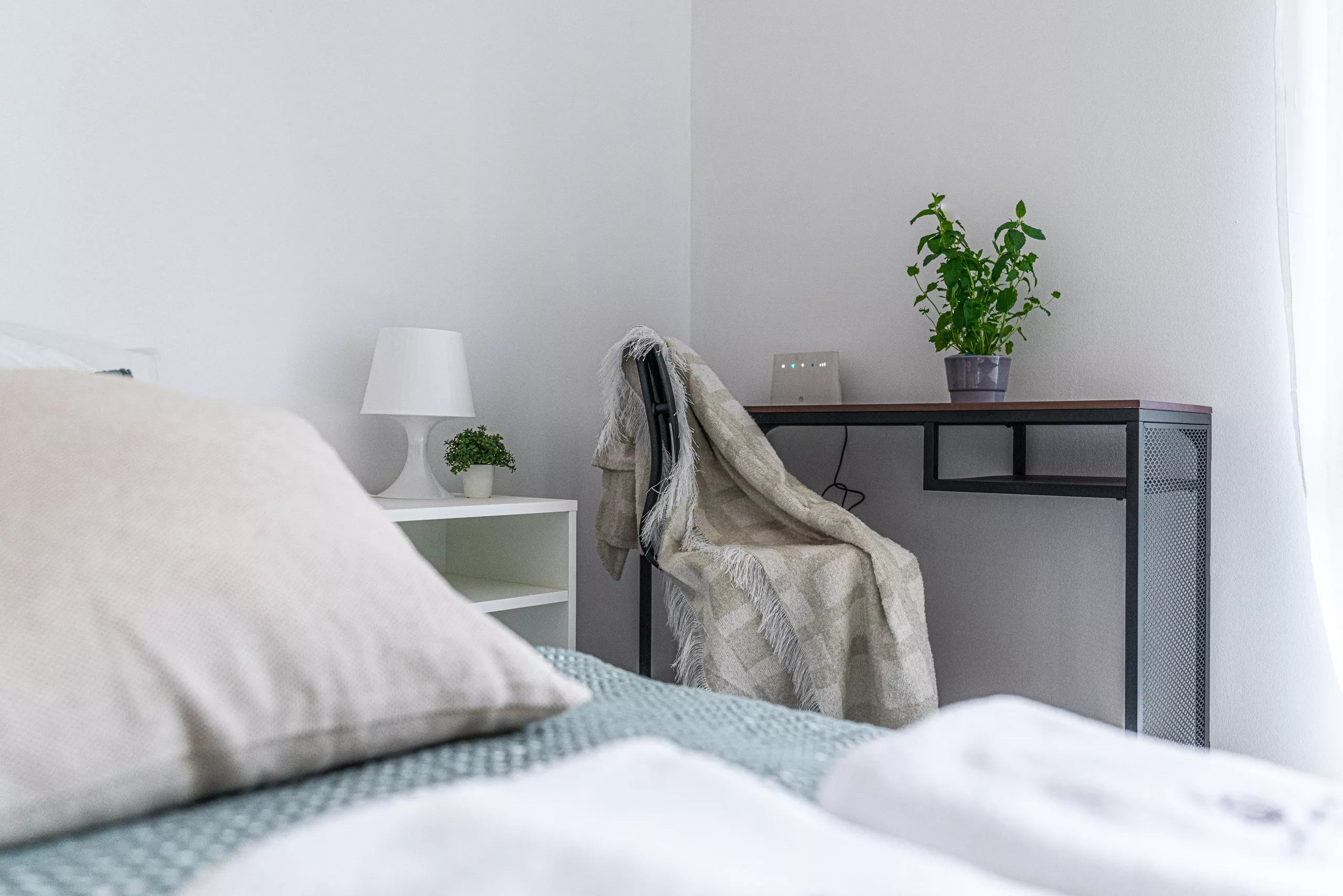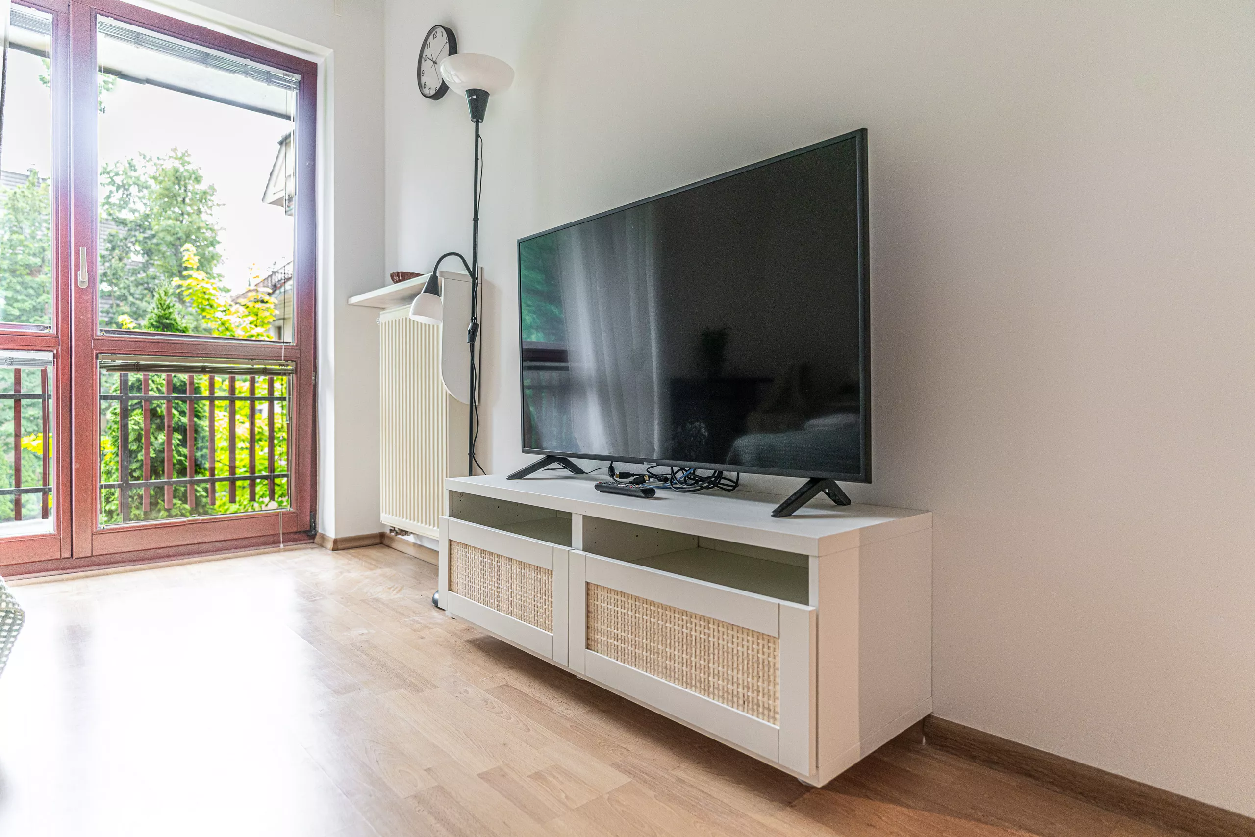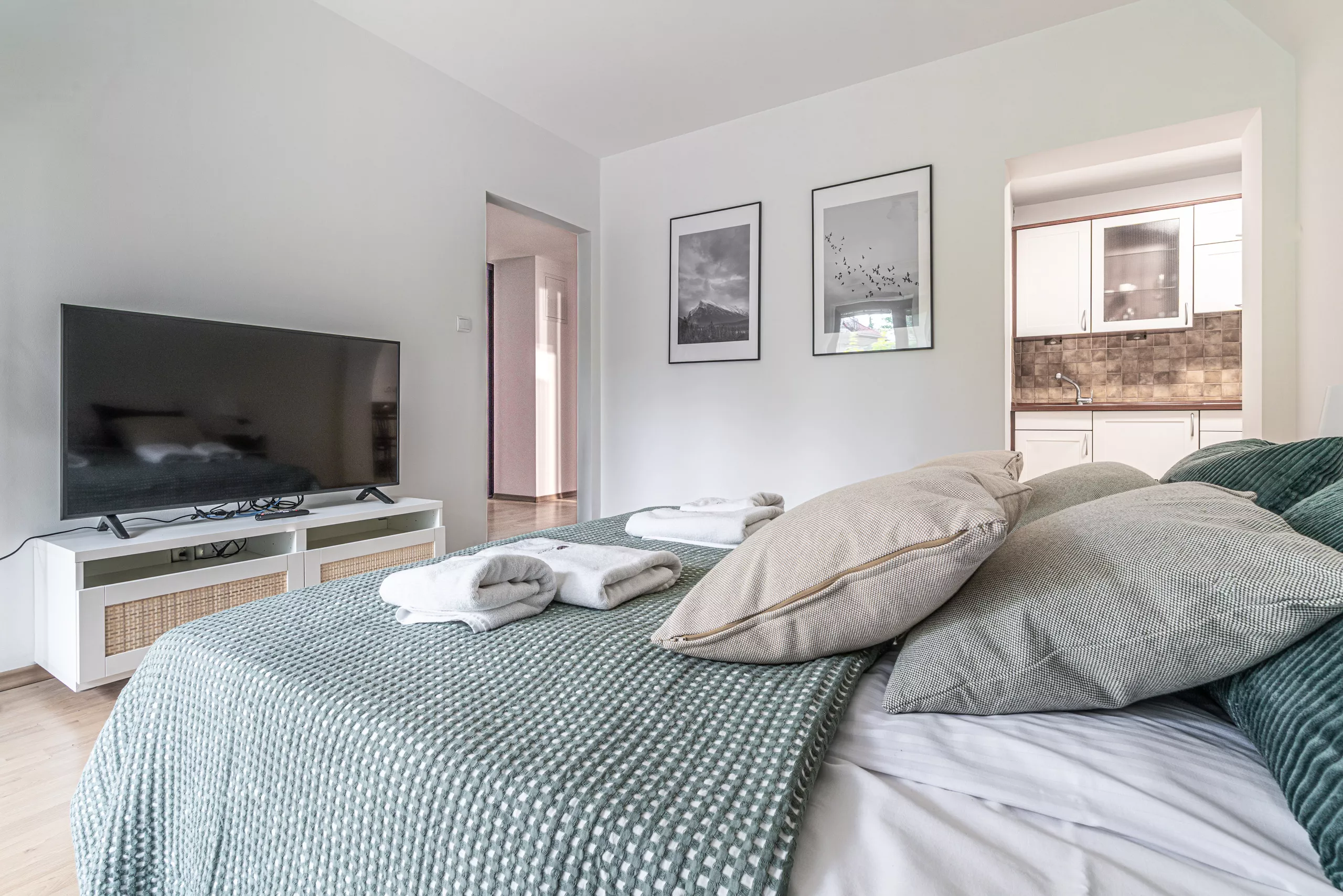 Pomieszczenie połączone jest z kuchnią otwartym wejściem, co sprawia, że całość tworzy spójną i przestronną strefę dzienną. W salonie znajduje się telewizor, wygodna sofa oraz stolik do pracy z komputerem – idealne miejsce do pracy zdalnej lub nauki. Dostęp do szybkiego internetu Wi-Fi zapewnia pełną wygodę codziennego użytkowania.