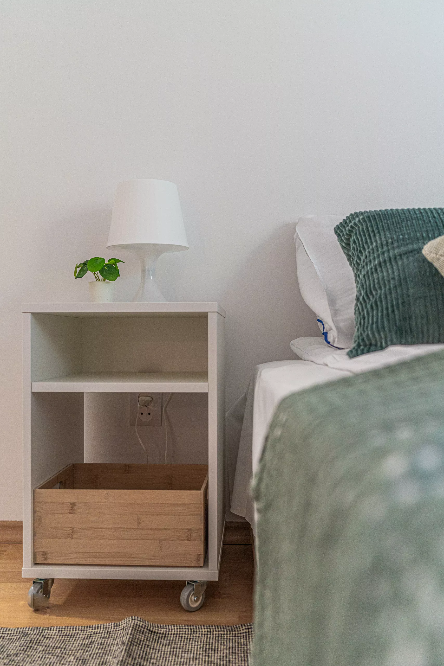 Jasna, przytulna sypialnia z wyraźnie wydzieloną przestrzenią i zamykanymi drzwiami. W centralnej części pomieszczenia znajduje się wygodne łóżko małżeńskie, ustawione tak, by zapewniało komfort i swobodę. Po obu jego stronach stoją eleganckie, dopasowane nocne szafki, na których umieszczono niewielkie lampki – idealne do stworzenia nastrojowego światła wieczorem lub do czytania przed snem. Całość wnętrza sprzyja odpoczynkowi i relaksowi.