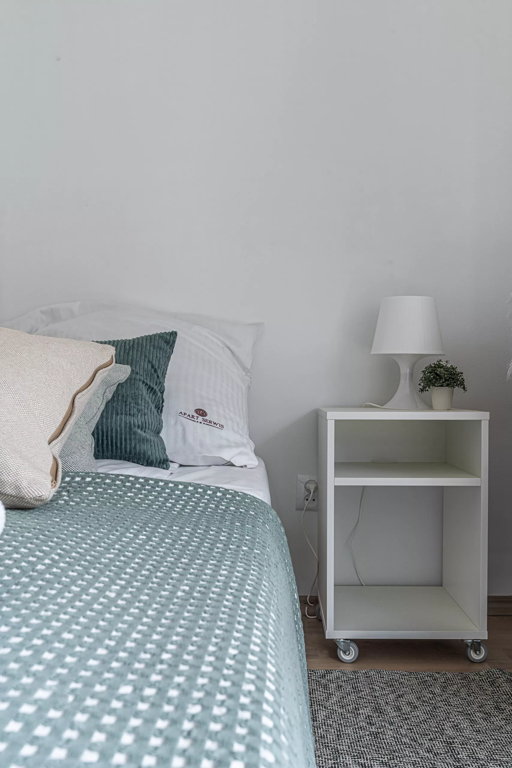 Duży, jasny salon pełniący również funkcję sypialni to komfortowa i wielofunkcyjna przestrzeń dzienna. W centralnej części znajduje się wygodne, małżeńskie łóżko, które zapewnia pełen komfort snu, a jednocześnie harmonijnie wpisuje się w aranżację wnętrza.